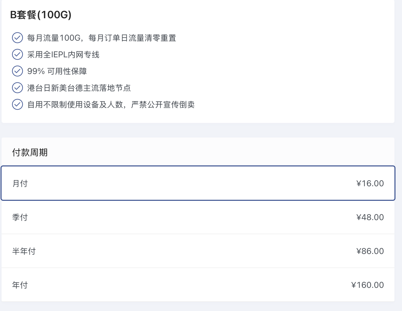 价格比较有性价比,对于我个人来说,最低配的套餐,16.8/月(0.8元支付手续费,也合理的),100GB套餐刚刚好